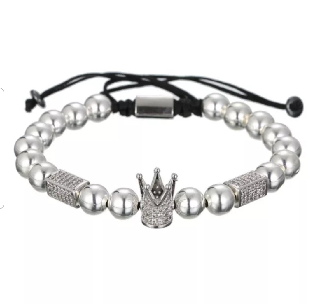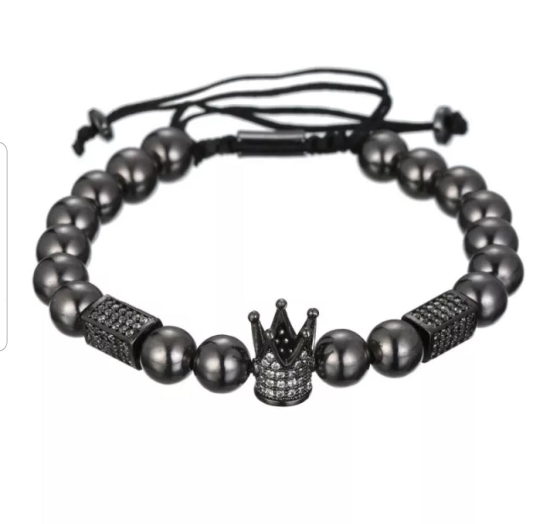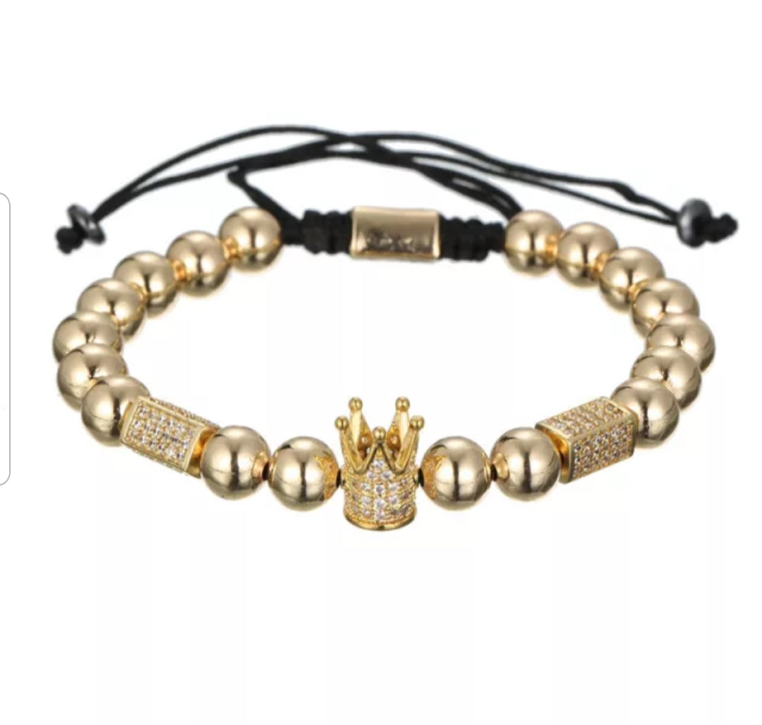 Luxury Men's Wrist Jewelry 8mm Copper Bead CZ Imperial Crown Adjustable Bracelet